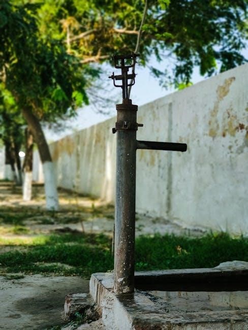 Common issues with manual water pumps include low flow rate, pump failure to start, and leaks. Check for blockages in hoses or valves, ensuring all connections are secure. Inspect for worn or damaged seals and replace them if necessary. If the pump is hard to operate, lubricate moving parts or adjust alignment. Regularly cleaning the pump and checking for corrosion can prevent malfunctions; Ensuring proper installation and following maintenance routines helps minimize issues, extending the pump’s lifespan and reliability in operation.